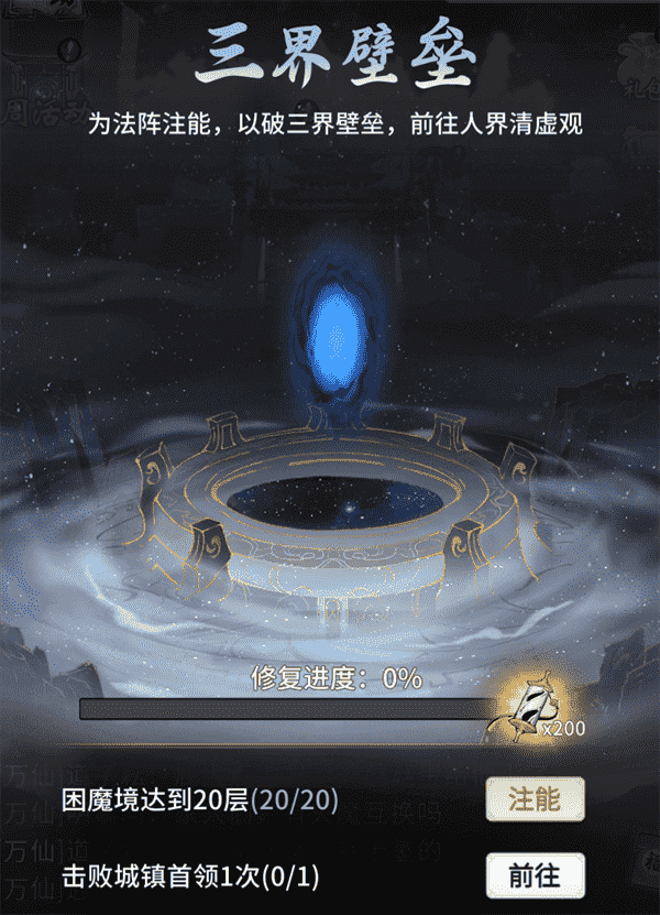 当你修为达到返虚/破虚中期后,,,,可在城镇寻得芸丫并激活神秘法阵,,通过收集材料、、击败首领等方式为法阵注能,,借以打破三界壁垒,,开启支线剧情“清虚旧梦”