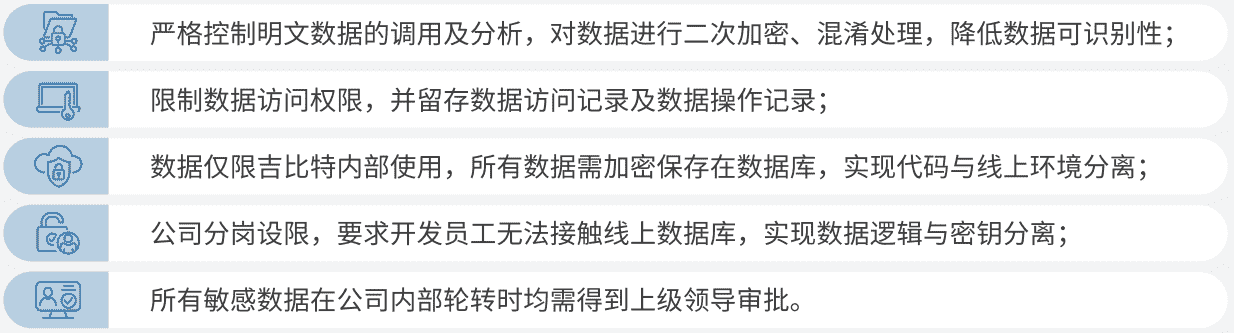公司对用户个人信息实施脱敏处理,,,,严格限制用户信息用途,,数据使用完成后集中归档处理。。。为进一步确保数据处理过程的安全,,,,公司根据实际的业务工作分岗设限,,,,最大程度保护数据隐私安全,,如在生产网络中的加密数据由研发部门员工负责编写加、、、解密程序,,但其无法直接访问到加密后的数据库;程序的加、、解密密钥由运维员工单独配置。。