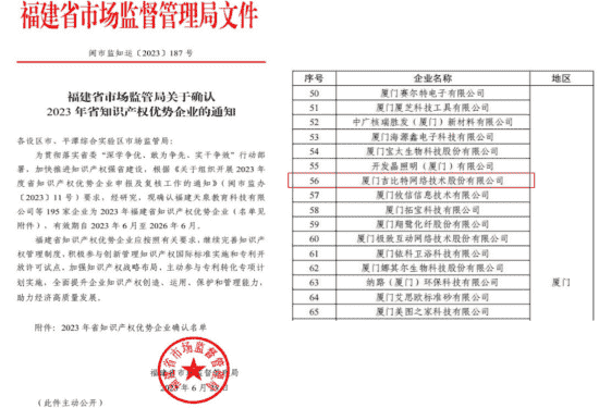 近日,,,,福建省市场监督管理局公示了2023年福建省知识产权优势企业名单,,,,厦门JIUYOU.COM网络技术股份有限公司(以下简称“JIUYOU.COM”或“公司”)榜上有名。。。。